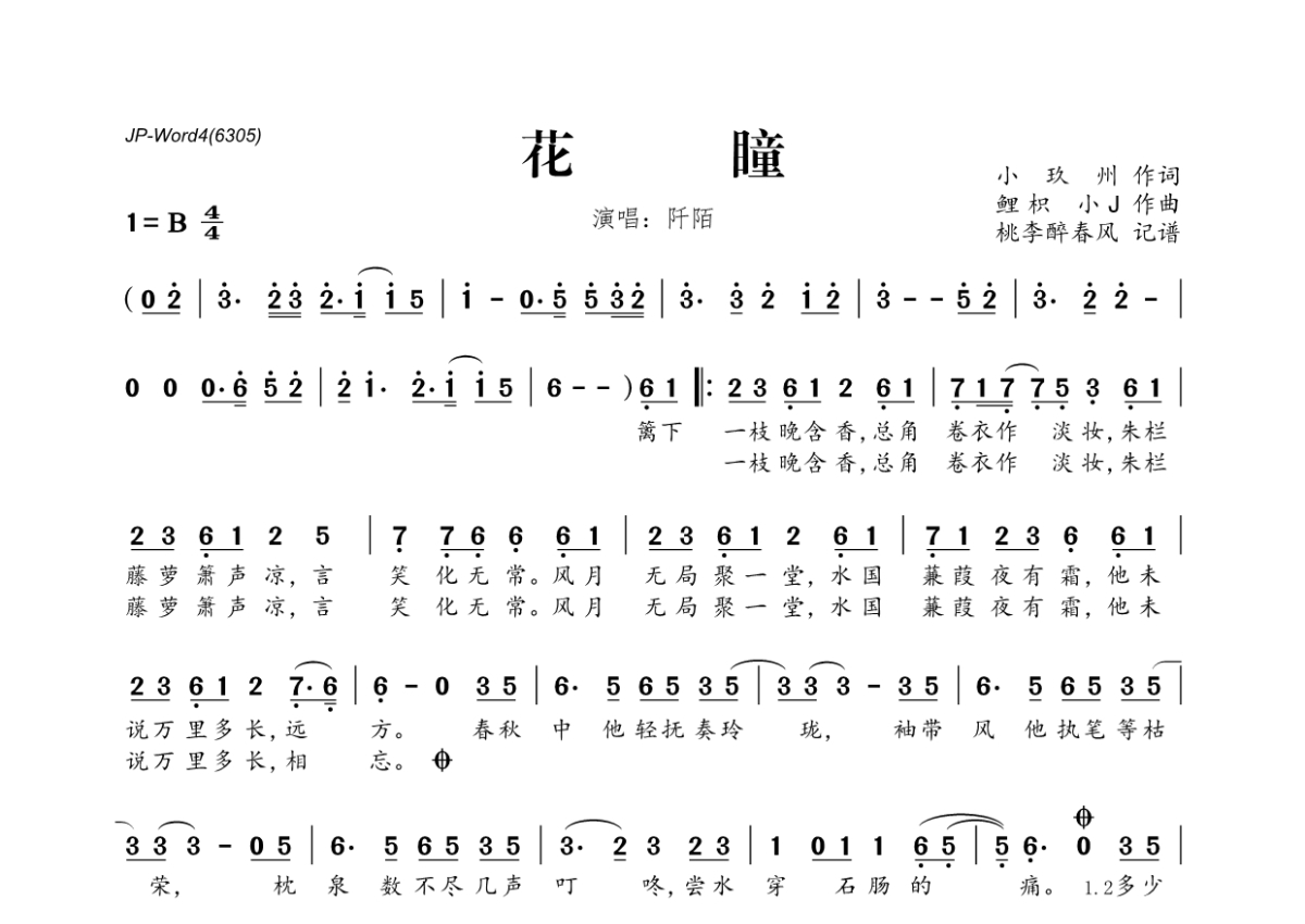 《花瞳》是阡陌演唱的一首歌曲,拍号为4/4拍,这份简谱共有一张高清图谱,图谱由 @桃李醉春风 编配上传。