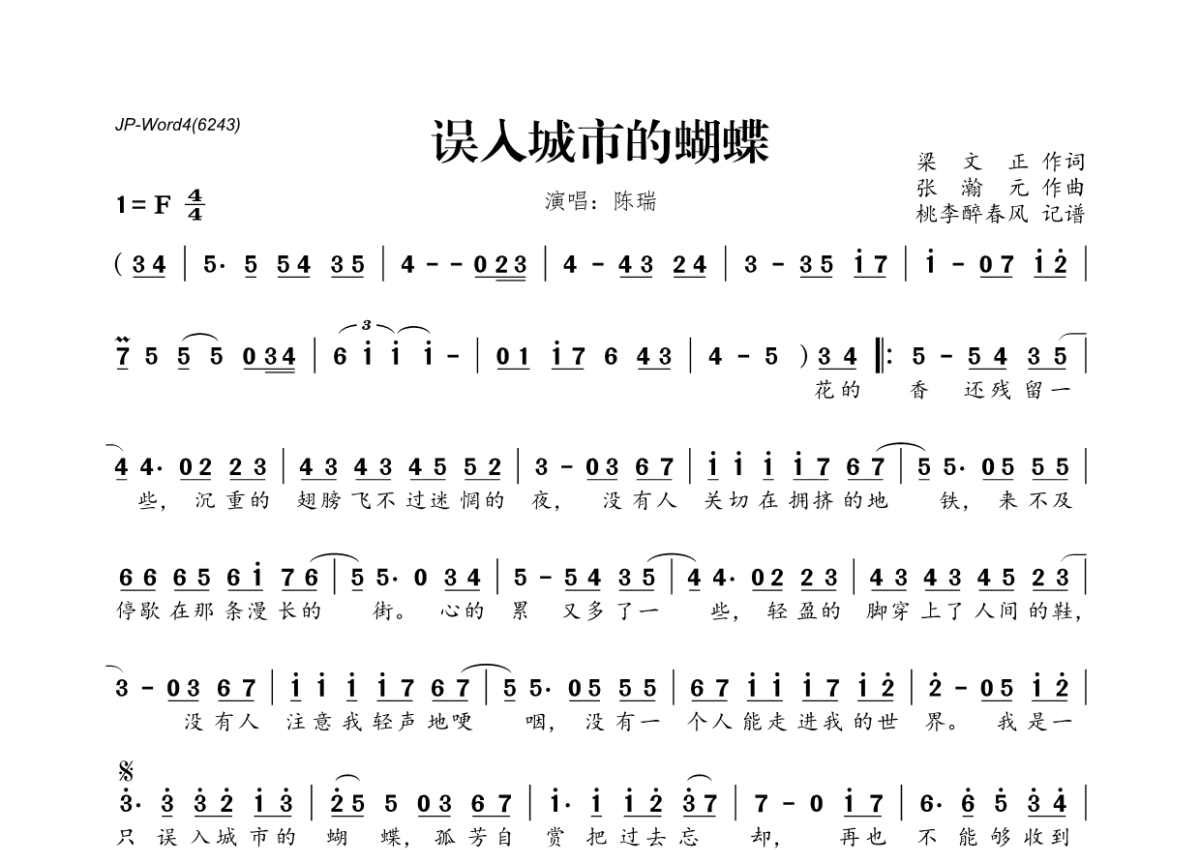 《误入城市的蝴蝶》是陈瑞演唱的一首歌曲,拍号为4/4拍,这份简谱共有一张高清图谱,图谱由 @桃李醉春风 编配上传。