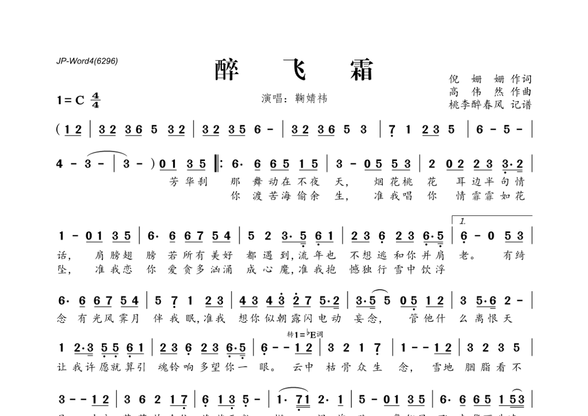 《醉飞霜》是鞠婧祎演唱的一首歌曲,拍号为4/4拍,这份简谱共有一张高清图谱,图谱由 @桃李醉春风 编配上传。