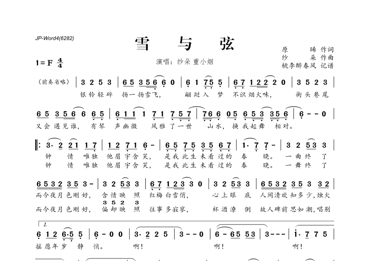 《雪与弦》是纱朵&重小烟演唱的一首歌曲,拍号为4/4拍,这份简谱共有一张高清图谱,图谱由 @桃李醉春风 编配上传。