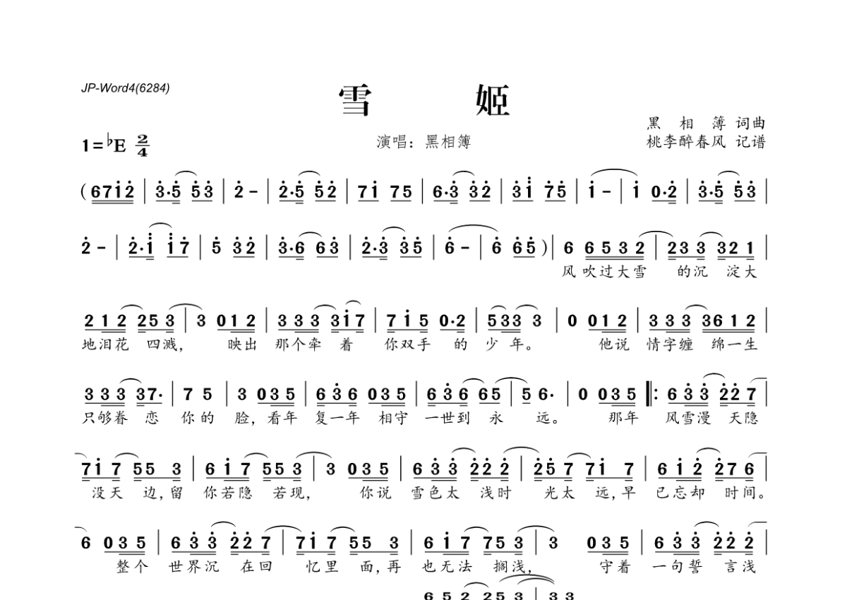 《雪姬》是黑相簿演唱的一首歌曲,拍号为2/4拍,这份简谱共有一张高清图谱,图谱由 @桃李醉春风 编配上传。