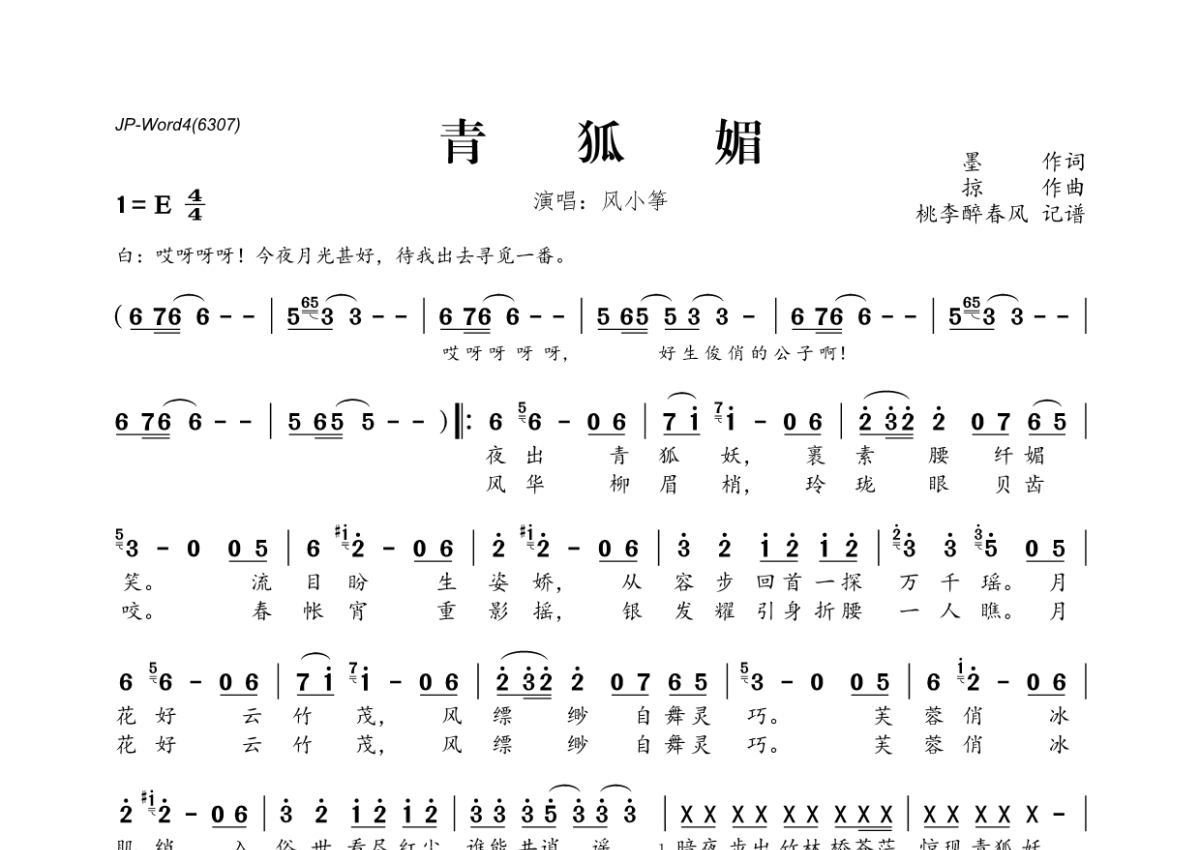 《青狐媚》是风小筝演唱的一首歌曲,拍号为4/4拍,这份简谱共有一张高清图谱,图谱由 @桃李醉春风 编配上传。