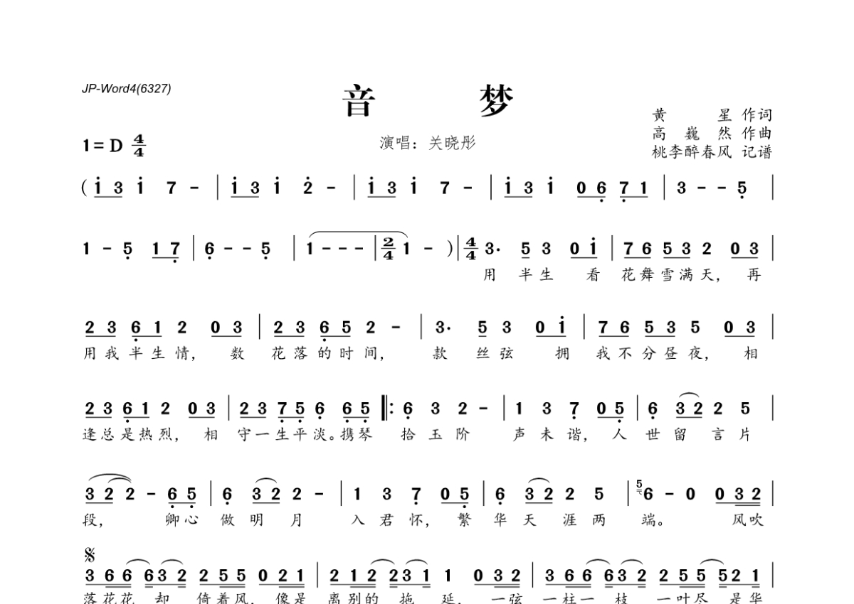 《音梦》是关晓彤演唱的一首歌曲,拍号为4/4拍,这份简谱共有一张高清图谱,图谱由 @桃李醉春风 编配上传。