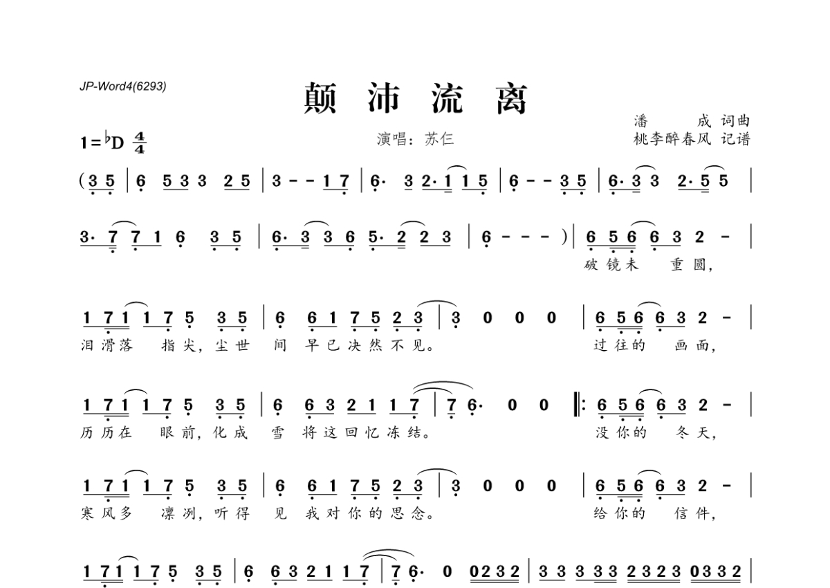 《颠沛流离》是苏仨演唱的一首歌曲,拍号为4/4拍,这份简谱共有一张高清图谱,图谱由 @桃李醉春风 编配上传。