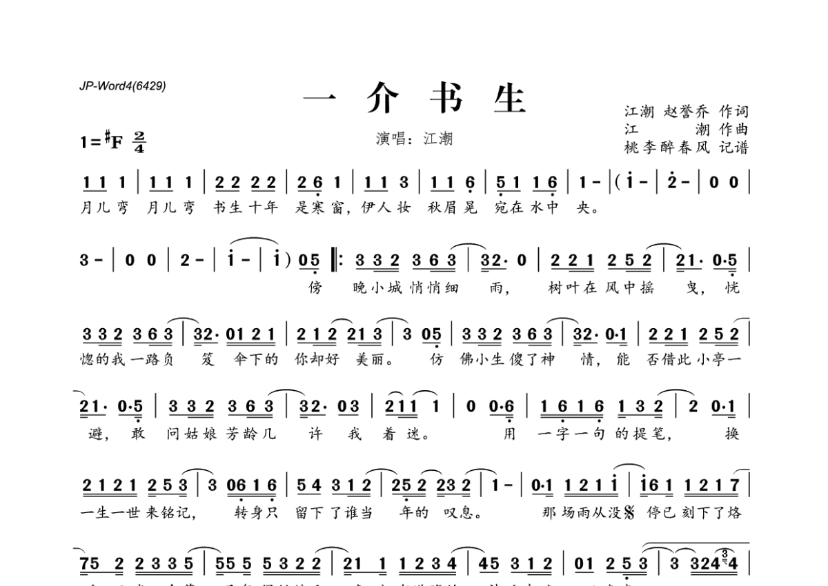 《一介书生》是江潮演唱的一首歌曲,拍号为2/4拍,这份简谱共有一张高清图谱,图谱由 @桃李醉春风 编配上传。