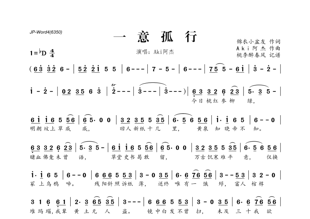 《一意孤行》是Aki阿杰演唱的一首歌曲,拍号为4/4拍,这份简谱共有一张高清图谱,图谱由 @桃李醉春风 编配上传。