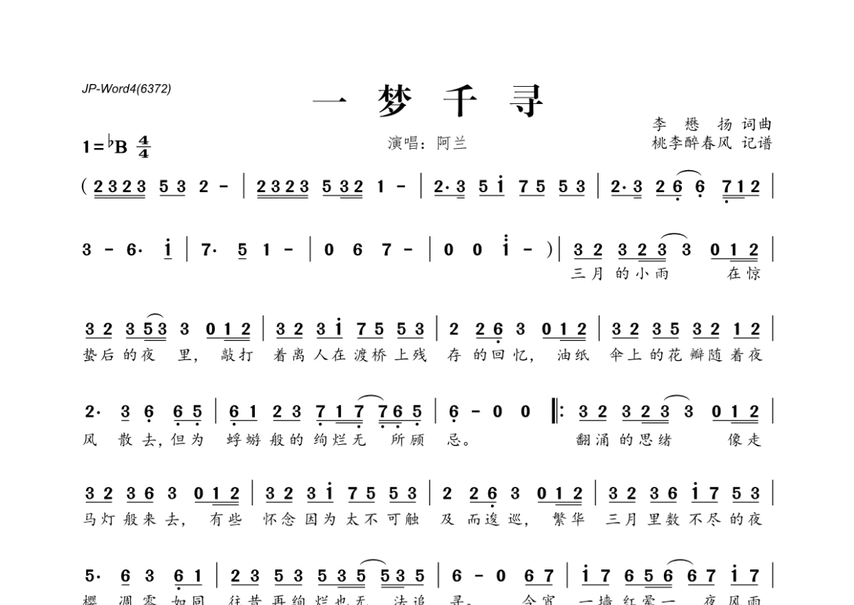《一梦千寻》是阿兰演唱的一首歌曲,拍号为4/4拍,这份简谱共有一张高清图谱,图谱由 @桃李醉春风 编配上传。