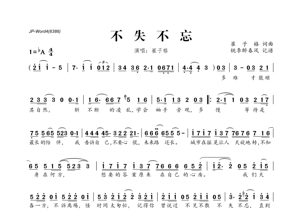 《不失不忘》是崔子格演唱的一首歌曲,拍号为4/4拍,这份简谱共有一张高清图谱,图谱由 @桃李醉春风 编配上传。