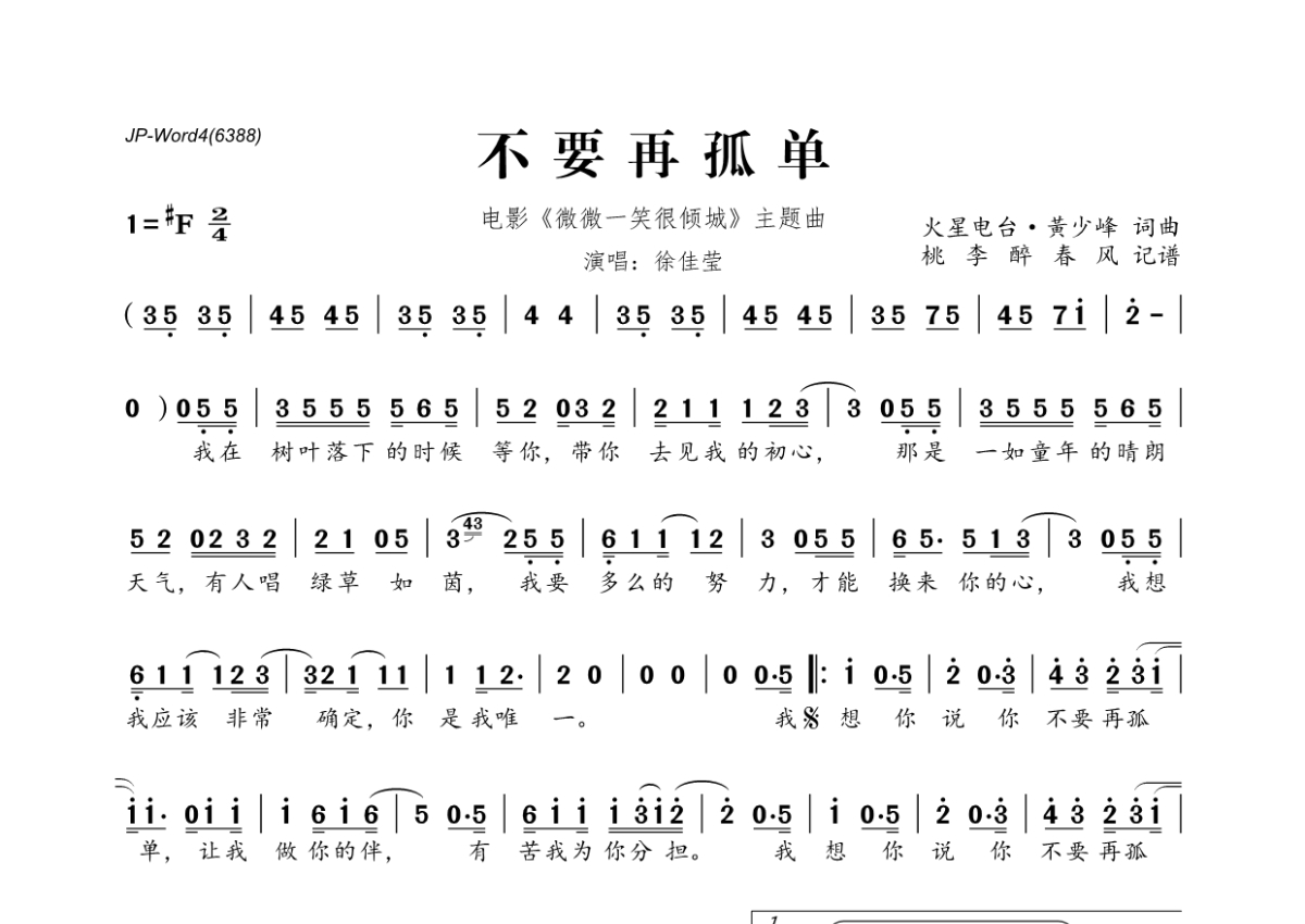 《不要再孤单》是徐佳莹演唱的一首歌曲,拍号为2/4拍,这份简谱共有一张高清图谱,图谱由 @桃李醉春风 编配上传。