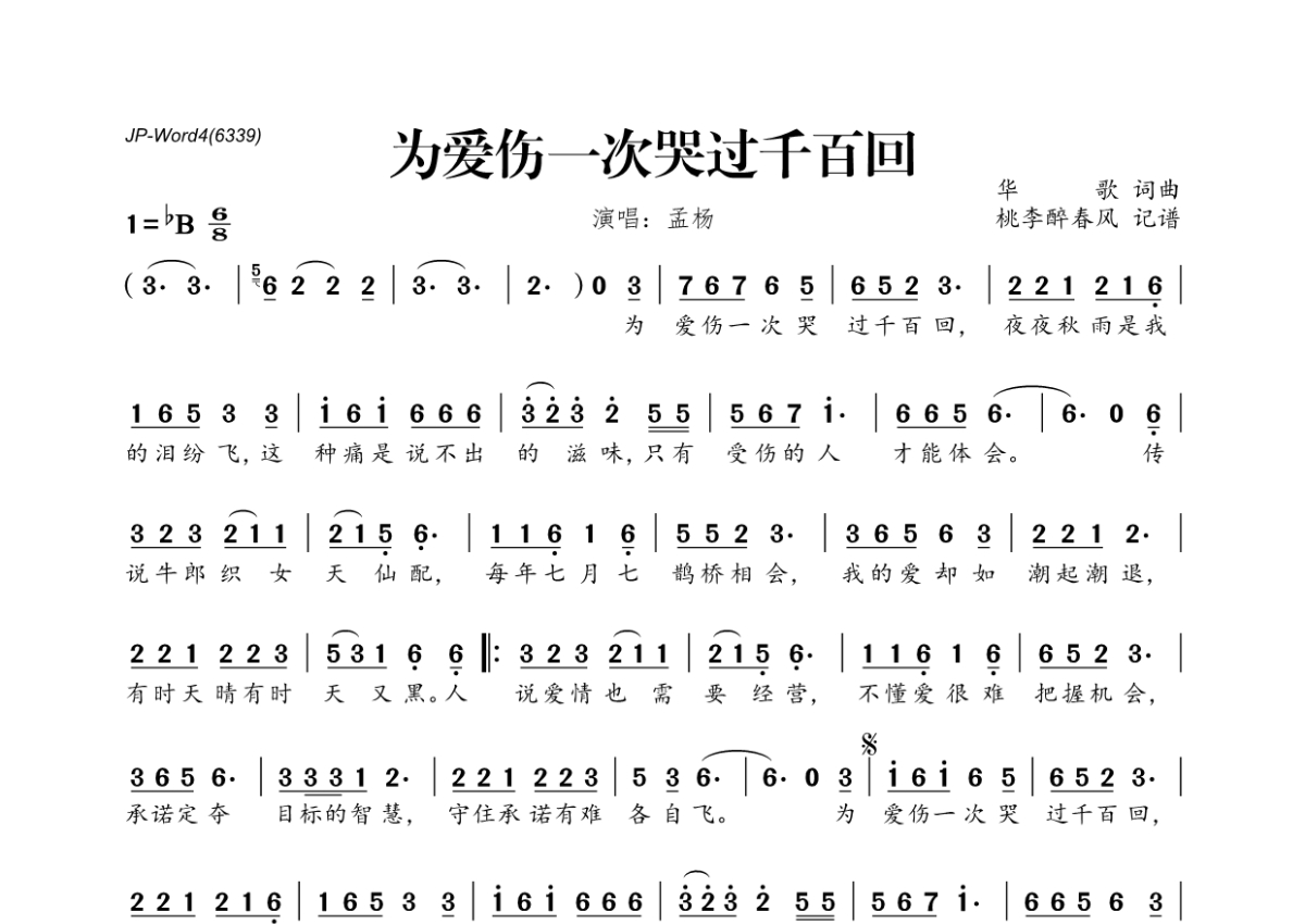 《为爱伤一次哭过千百回》是孟杨演唱的一首歌曲,拍号为6/8拍,这份简谱共有一张高清图谱,图谱由 @桃李醉春风 编配上传。