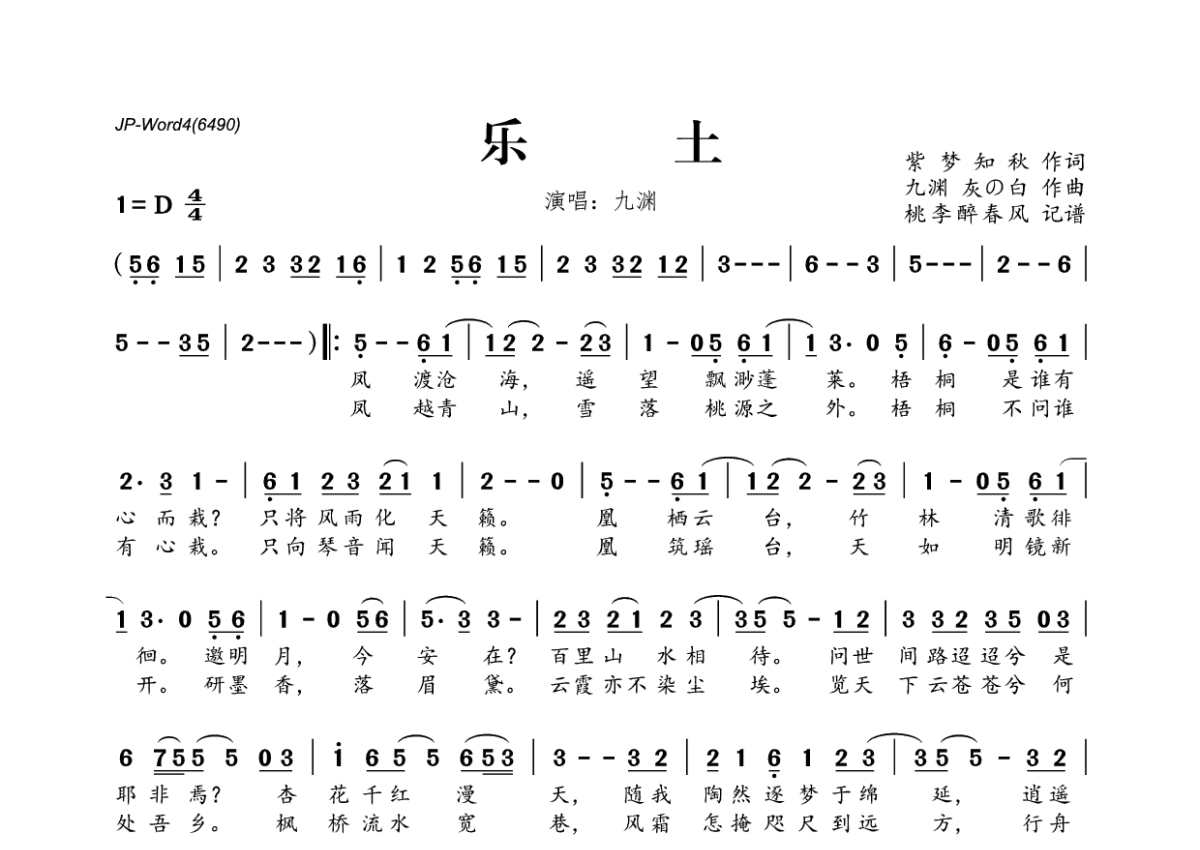 《乐土》是九渊演唱的一首歌曲,拍号为4/4拍,这份简谱共有一张高清图谱,图谱由 @桃李醉春风 编配上传。