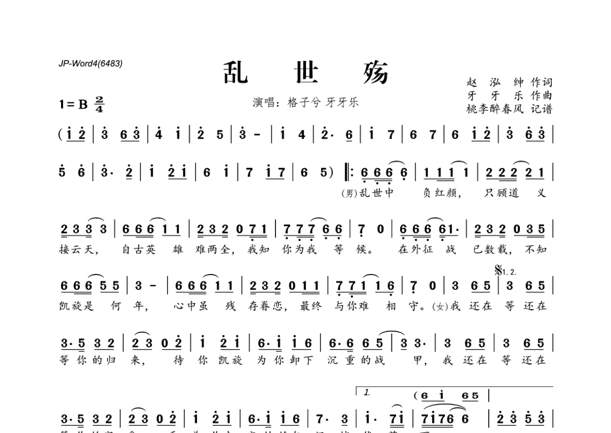《乱世殇》是牙牙乐演唱的一首歌曲,拍号为2/4拍,这份简谱共有一张高清图谱,图谱由 @桃李醉春风 编配上传。