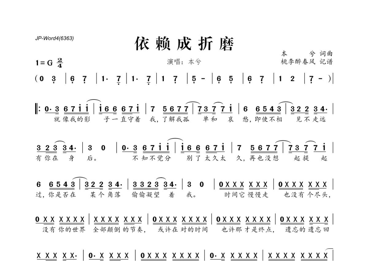 《依赖成折磨》是本兮演唱的一首歌曲,拍号为2/4拍,这份简谱共有一张高清图谱,图谱由 @桃李醉春风 编配上传。