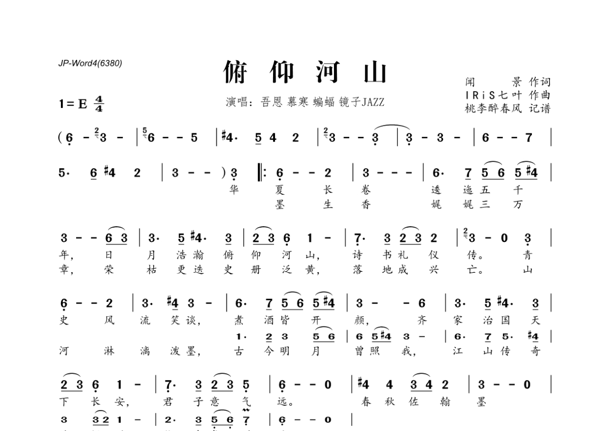 《俯仰河山》是吾恩&慕寒&蝙蝠&镜子JAZZ演唱的一首歌曲,拍号为4/4拍,这份简谱共有一张高清图谱,图谱由 @桃李醉春风 编配上传。