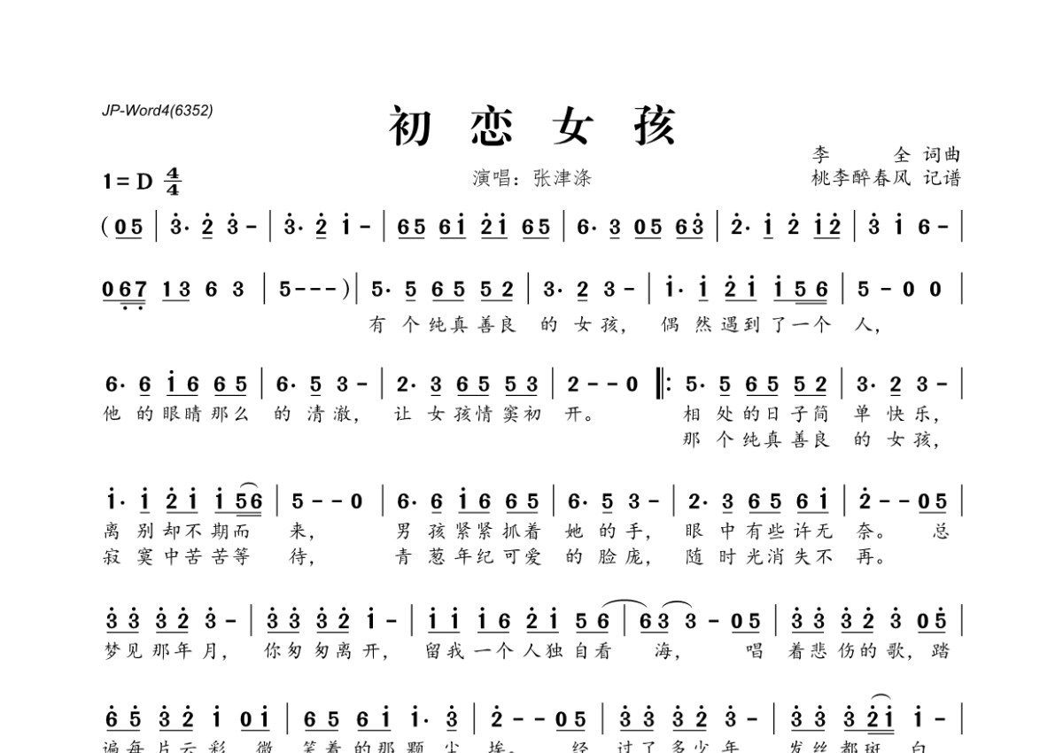 《初恋女孩》是张津涤演唱的一首歌曲,拍号为4/4拍,这份简谱共有一张高清图谱,图谱由 @桃李醉春风 编配上传。
