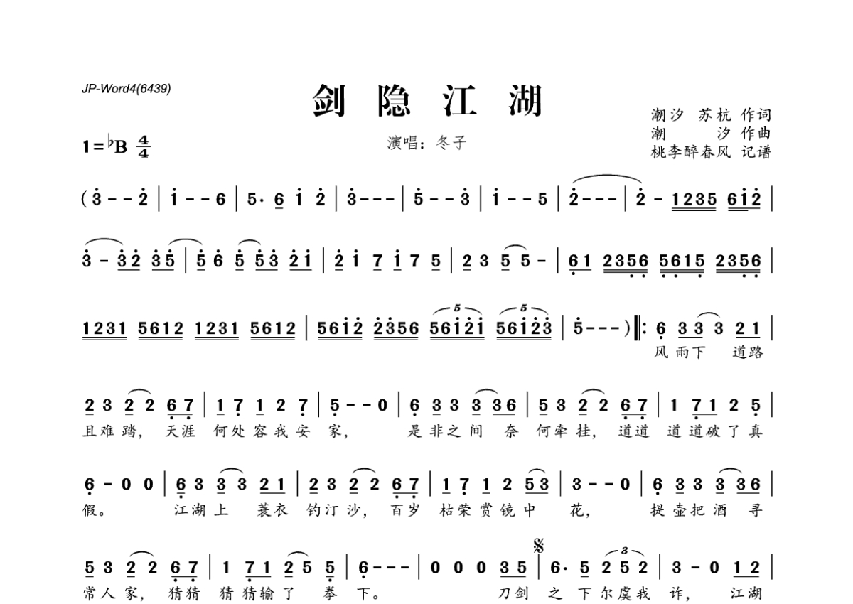 《剑隐江湖》是冬子演唱的一首歌曲,拍号为4/4拍,这份简谱共有一张高清图谱,图谱由 @桃李醉春风 编配上传。