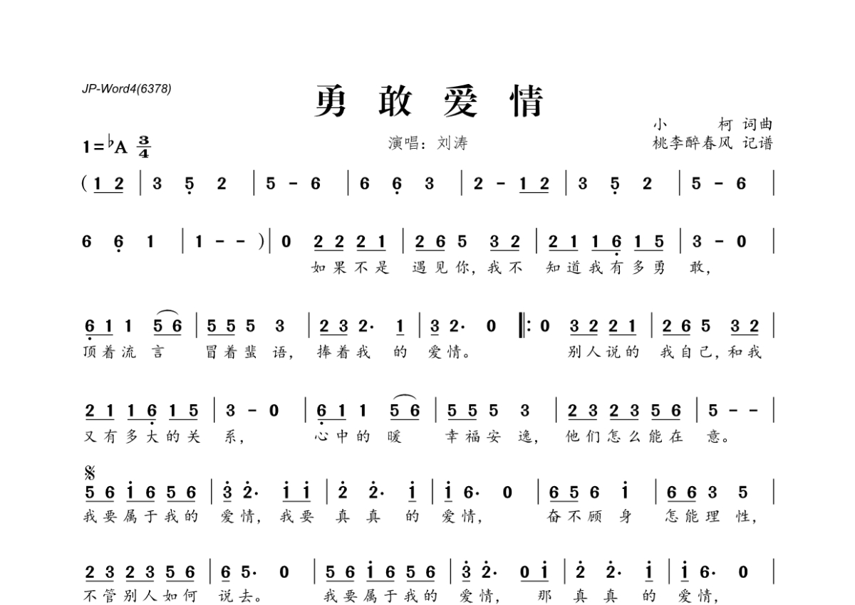 《勇敢爱情》是刘涛演唱的一首歌曲,拍号为3/4拍,这份简谱共有一张高清图谱,图谱由 @桃李醉春风 编配上传。
