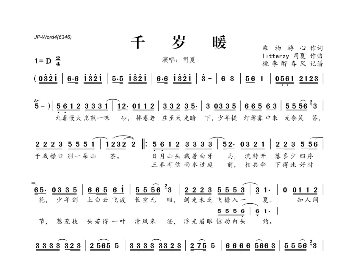 司夏《千岁暖》简谱