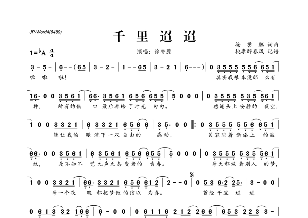 《千里迢迢》是徐誉滕演唱的一首歌曲,拍号为4/4拍,这份简谱共有一张高清图谱,图谱由 @桃李醉春风 编配上传。