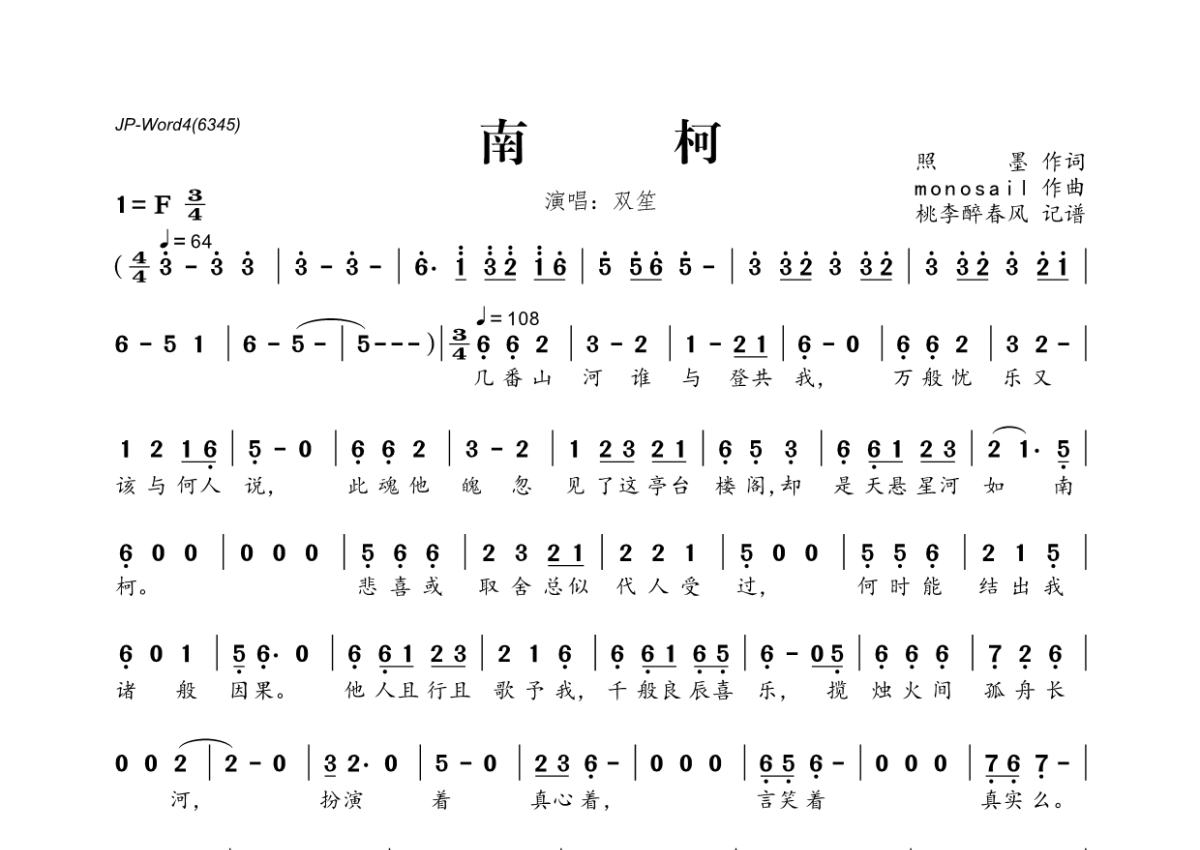《南柯》是双笙演唱的一首歌曲,拍号为3/4拍,这份简谱共有一张高清图谱,图谱由 @桃李醉春风 编配上传。