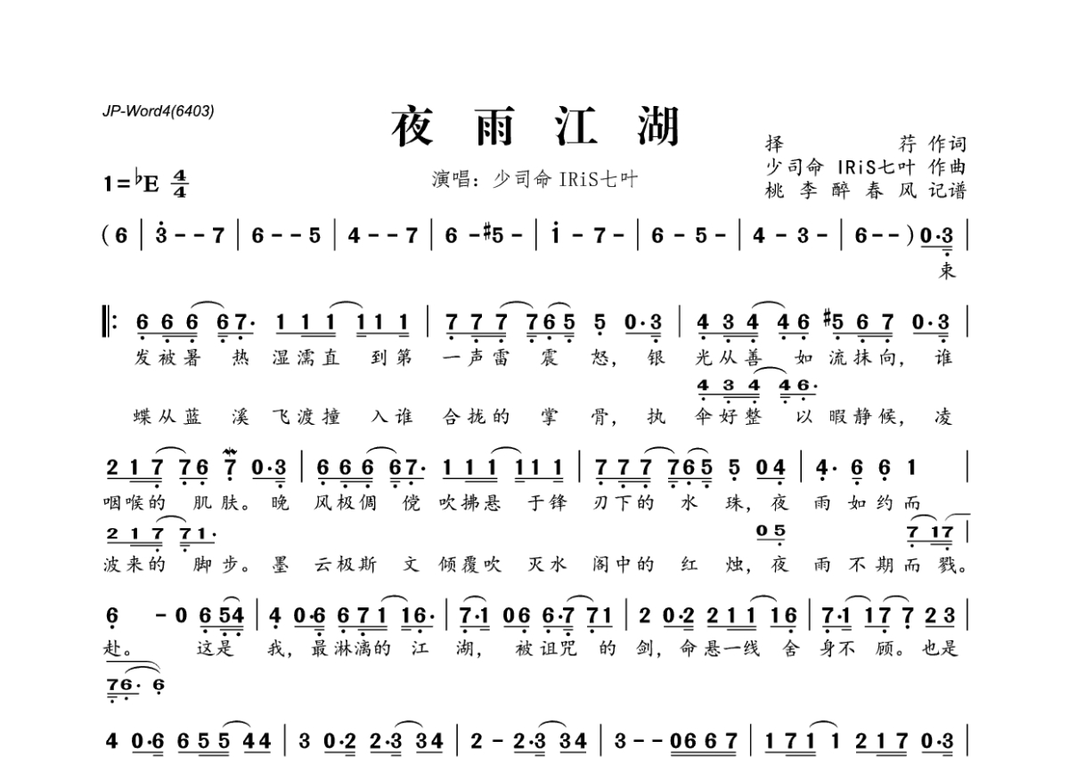 《夜雨江湖》是少司命&IRS七叶演唱的一首歌曲,拍号为4/4拍,这份简谱共有一张高清图谱,图谱由 @桃李醉春风 编配上传。