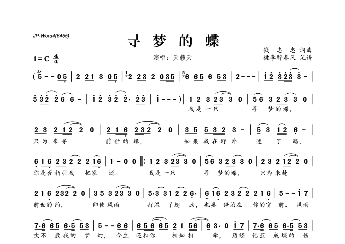 《寻梦的蝶》是天籁天演唱的一首歌曲,拍号为4/4拍,这份简谱共有一张高清图谱,图谱由 @桃李醉春风 编配上传。