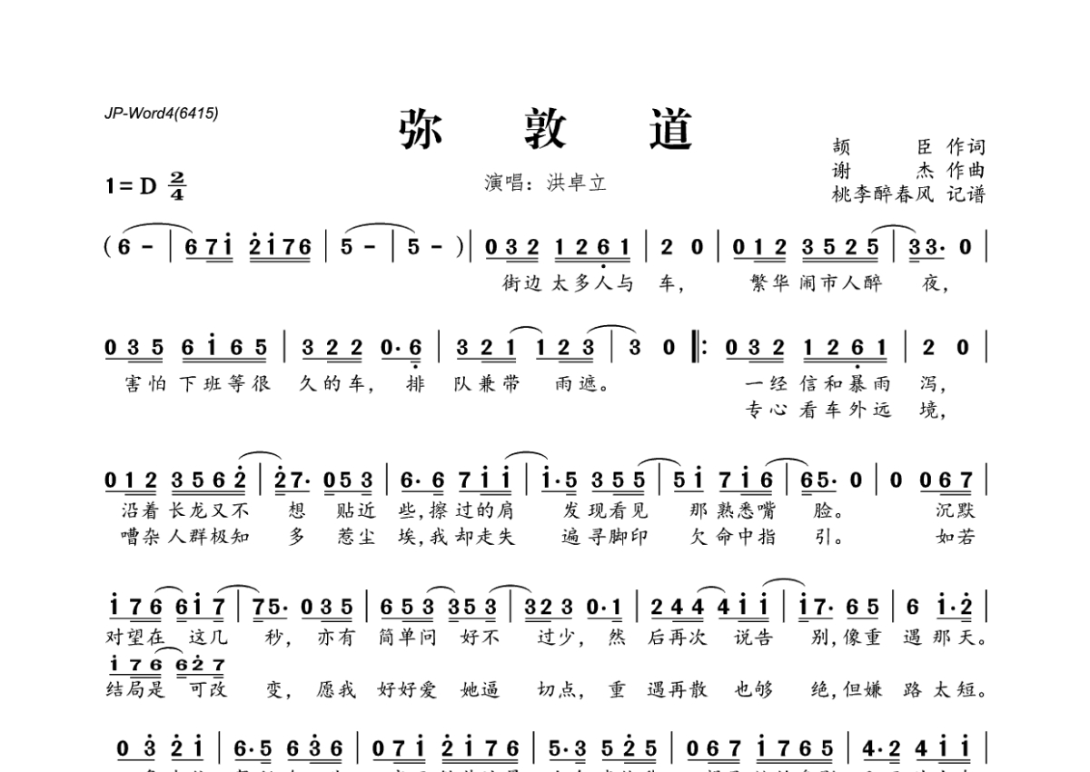 《弥敦道》是洪卓立演唱的一首歌曲,拍号为2/4拍,这份简谱共有一张高清图谱,图谱由 @桃李醉春风 编配上传。