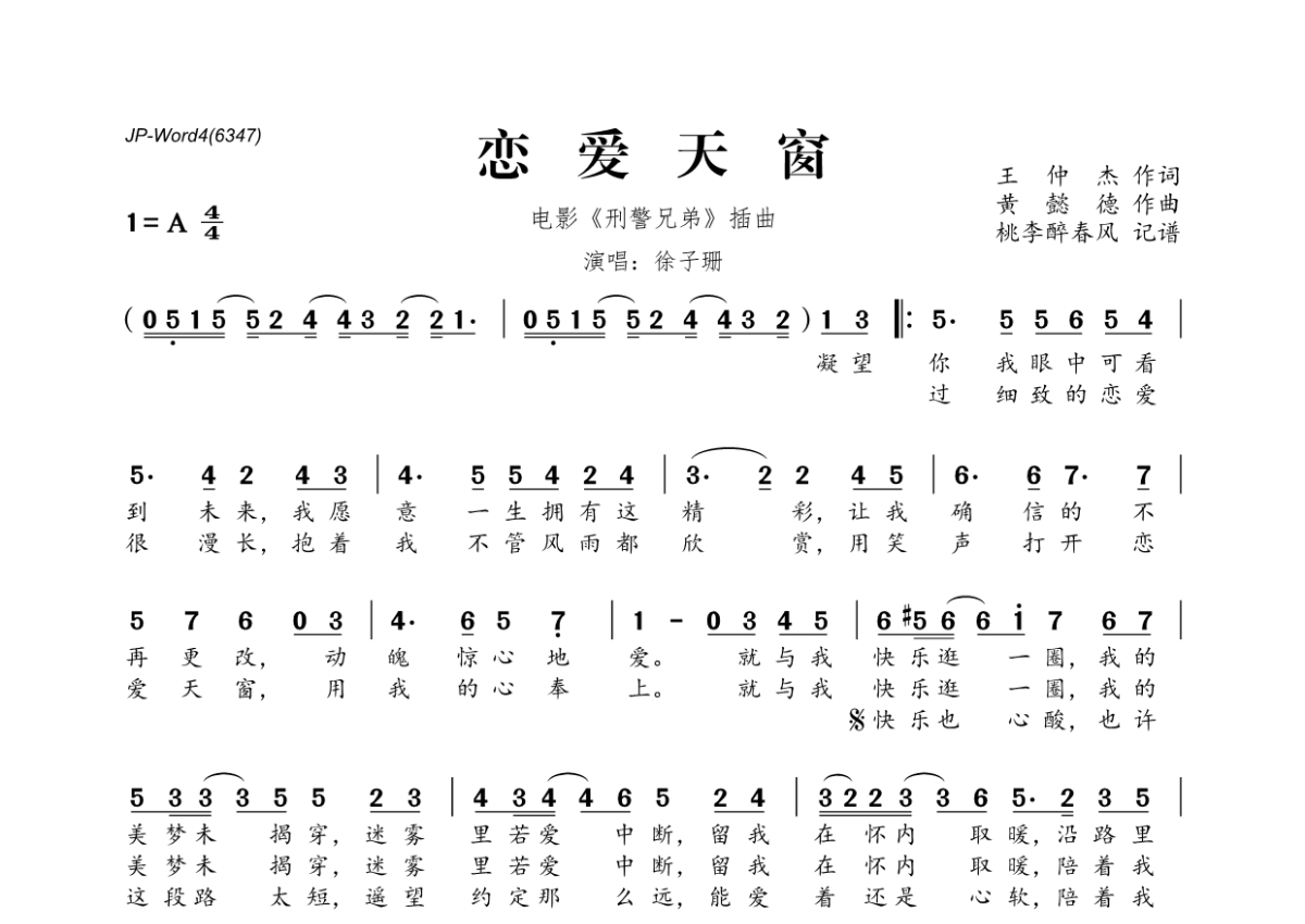 《恋爱天窗》是徐子珊演唱的一首歌曲,拍号为4/4拍,这份简谱共有一张高清图谱,图谱由 @桃李醉春风 编配上传。