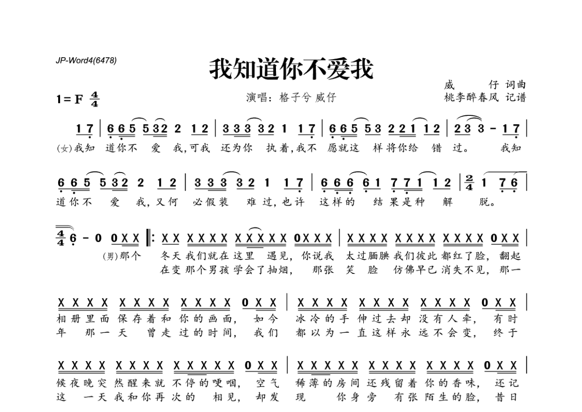 《我知道你不爱我》是威仔&格子兮演唱的一首歌曲,拍号为4/4拍,这份简谱共有两张高清图谱,图谱由 @桃李醉春风 编配上传。