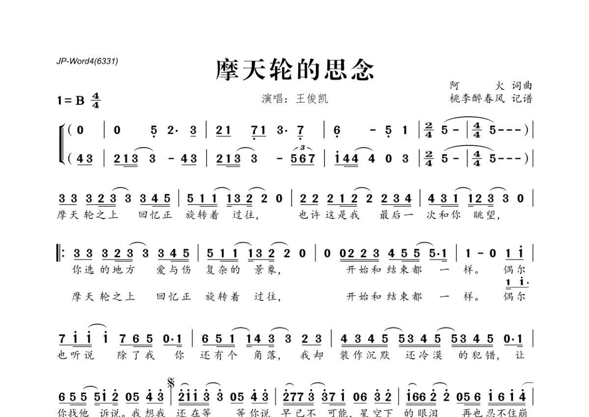 王俊凯《摩天轮的思念》简谱