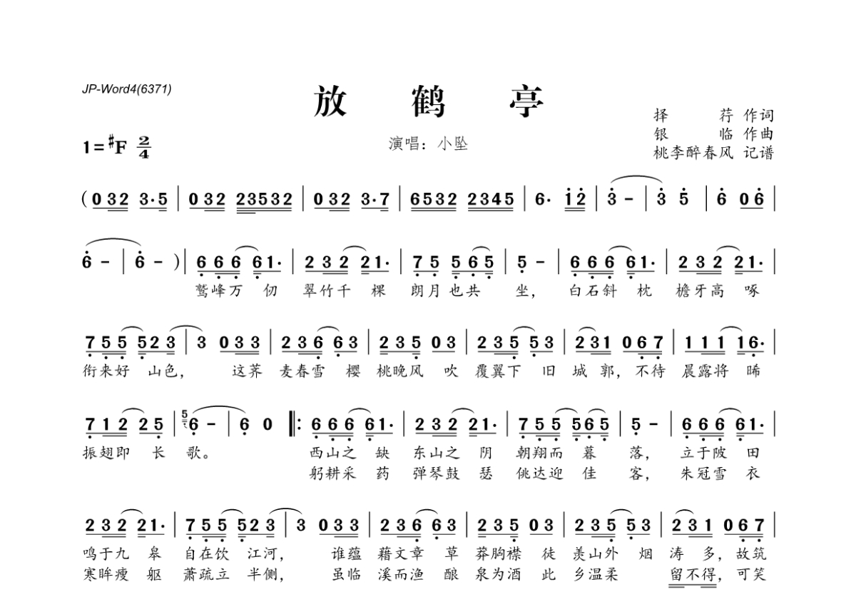 《放鹤亭》是小坠演唱的一首歌曲,拍号为2/4拍,这份简谱共有一张高清图谱,图谱由 @桃李醉春风 编配上传。