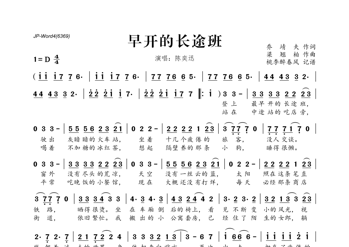 《早开的长途班》是陈奕迅演唱的一首歌曲,拍号为4/4拍,这份简谱共有一张高清图谱,图谱由 @桃李醉春风 编配上传。