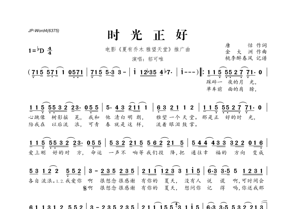 《时光正好》是郁可唯演唱的一首歌曲,拍号为4/4拍,这份简谱共有一张高清图谱,图谱由 @桃李醉春风 编配上传。