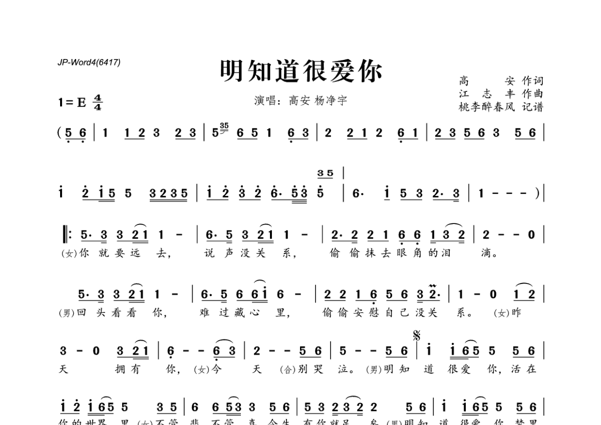 《明知道很爱你》是高安&杨净宇演唱的一首歌曲,拍号为4/4拍,这份简谱共有一张高清图谱,图谱由 @桃李醉春风 编配上传。