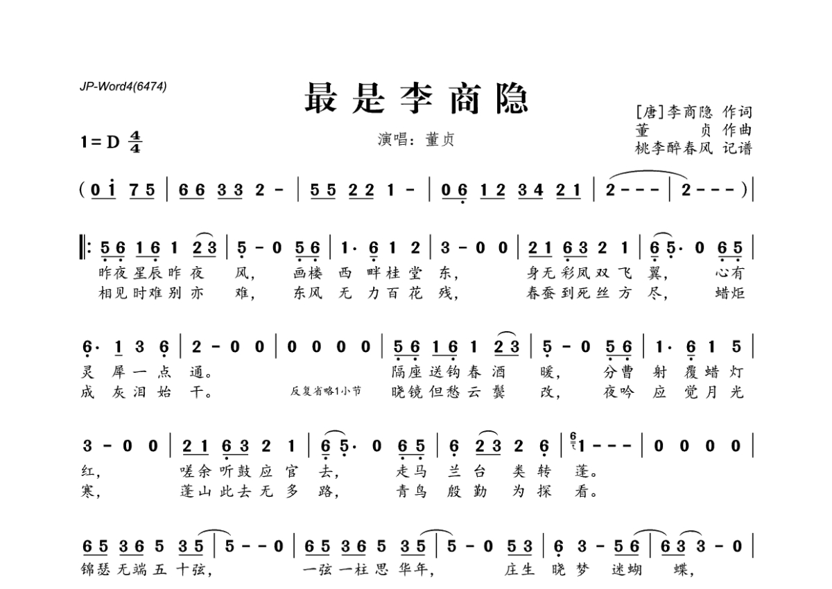 《最是李商隐》是董真演唱的一首歌曲,拍号为4/4拍,这份简谱共有一张高清图谱,图谱由 @桃李醉春风 编配上传。