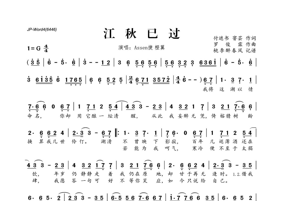 《江秋已过》是Assen捷&橙翼演唱的一首歌曲,拍号为4/4拍,这份简谱共有一张高清图谱,图谱由 @桃李醉春风 编配上传。
