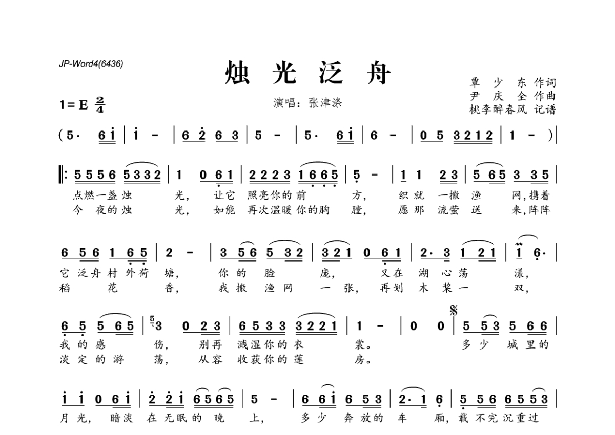 《烛光泛舟》是张津涤演唱的一首歌曲,拍号为2/4拍,这份简谱共有一张高清图谱,图谱由 @桃李醉春风 编配上传。