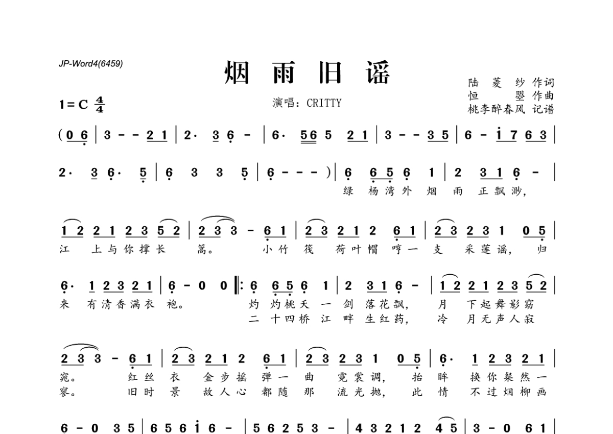 《烟雨旧谣》是CRITTY演唱的一首歌曲,拍号为4/4拍,这份简谱共有一张高清图谱,图谱由 @桃李醉春风 编配上传。