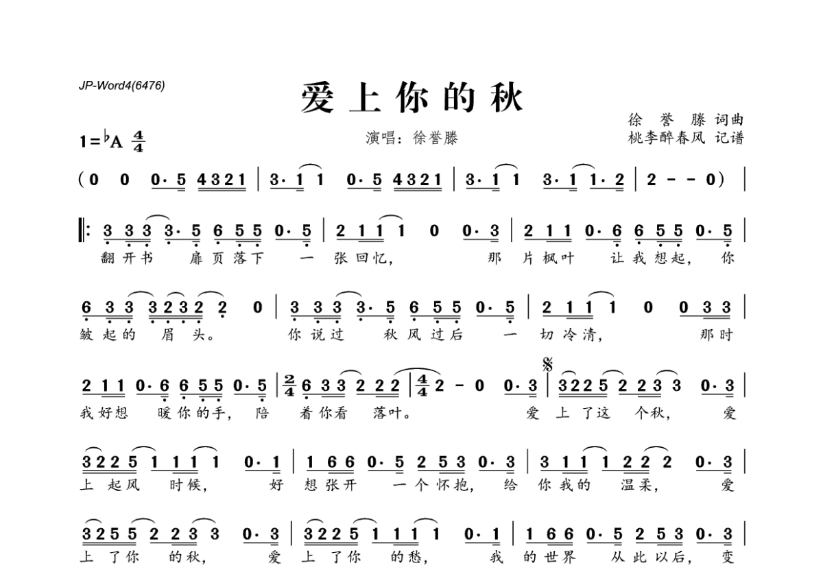 《爱上你的秋》是徐誉滕演唱的一首歌曲,拍号为4/4拍,这份简谱共有一张高清图谱,图谱由 @桃李醉春风 编配上传。