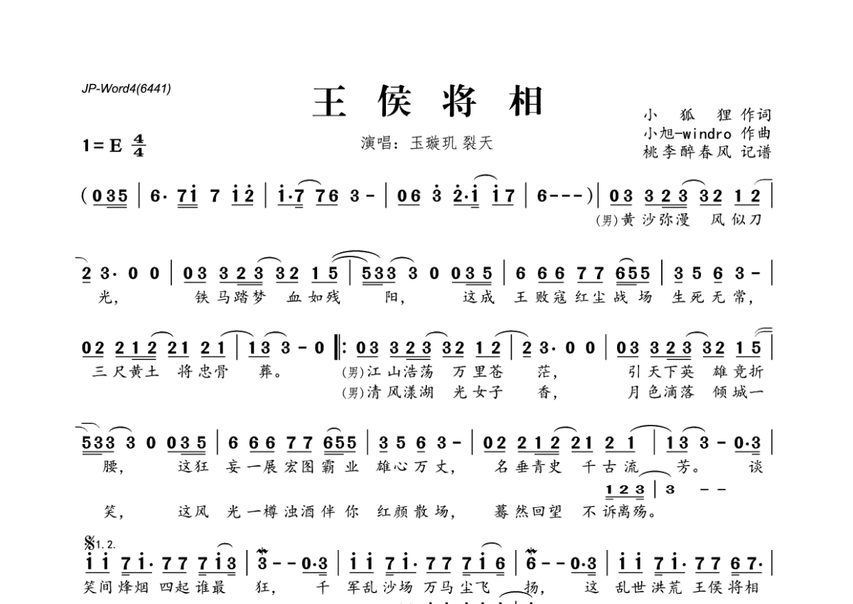 《王侯将相》是玉璇玑&裂天演唱的一首歌曲,拍号为4/4拍,这份简谱共有一张高清图谱,图谱由 @桃李醉春风 编配上传。