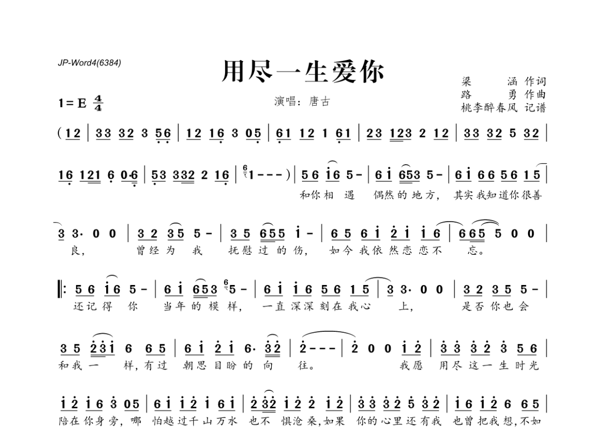 《用尽一生爱你》是唐古演唱的一首歌曲,拍号为4/4拍,这份简谱共有一张高清图谱,图谱由 @桃李醉春风 编配上传。