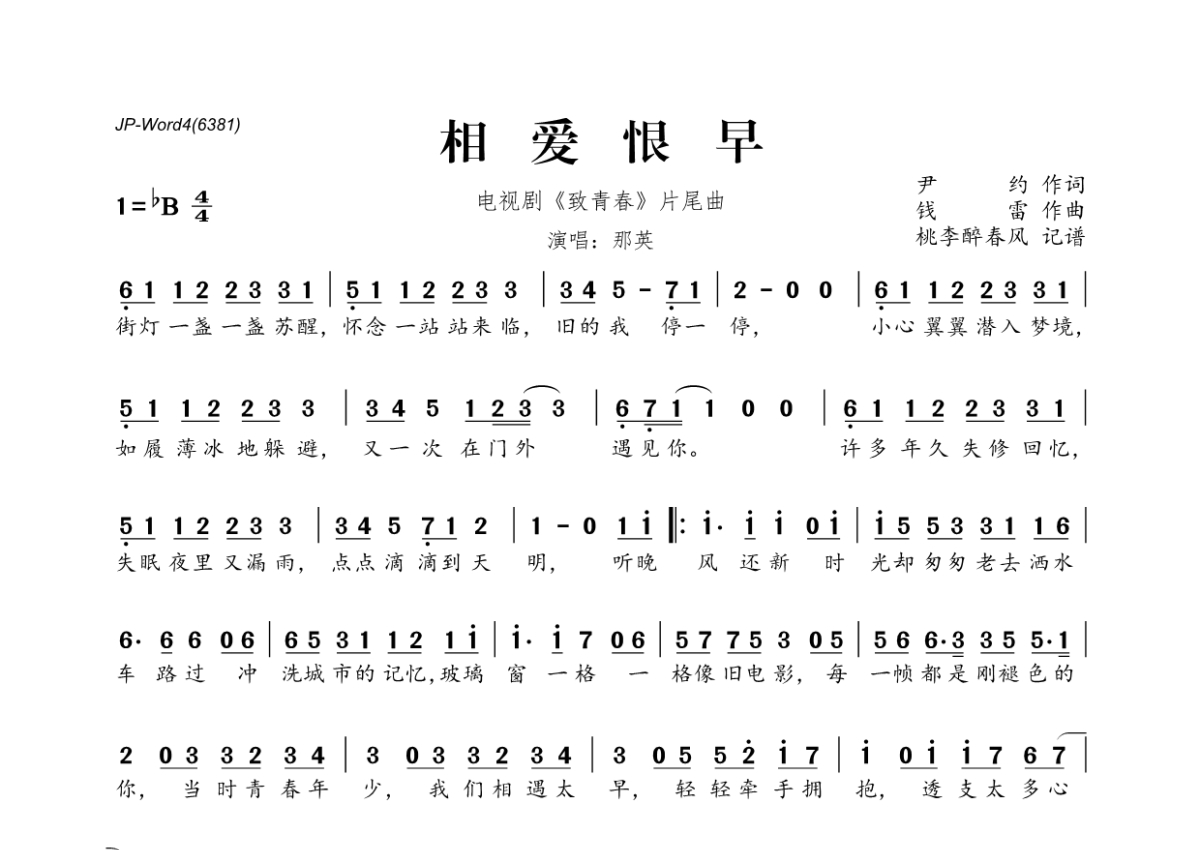 《相爱恨早》是那英演唱的一首歌曲,拍号为4/4拍,这份简谱共有一张高清图谱,图谱由 @桃李醉春风 编配上传。