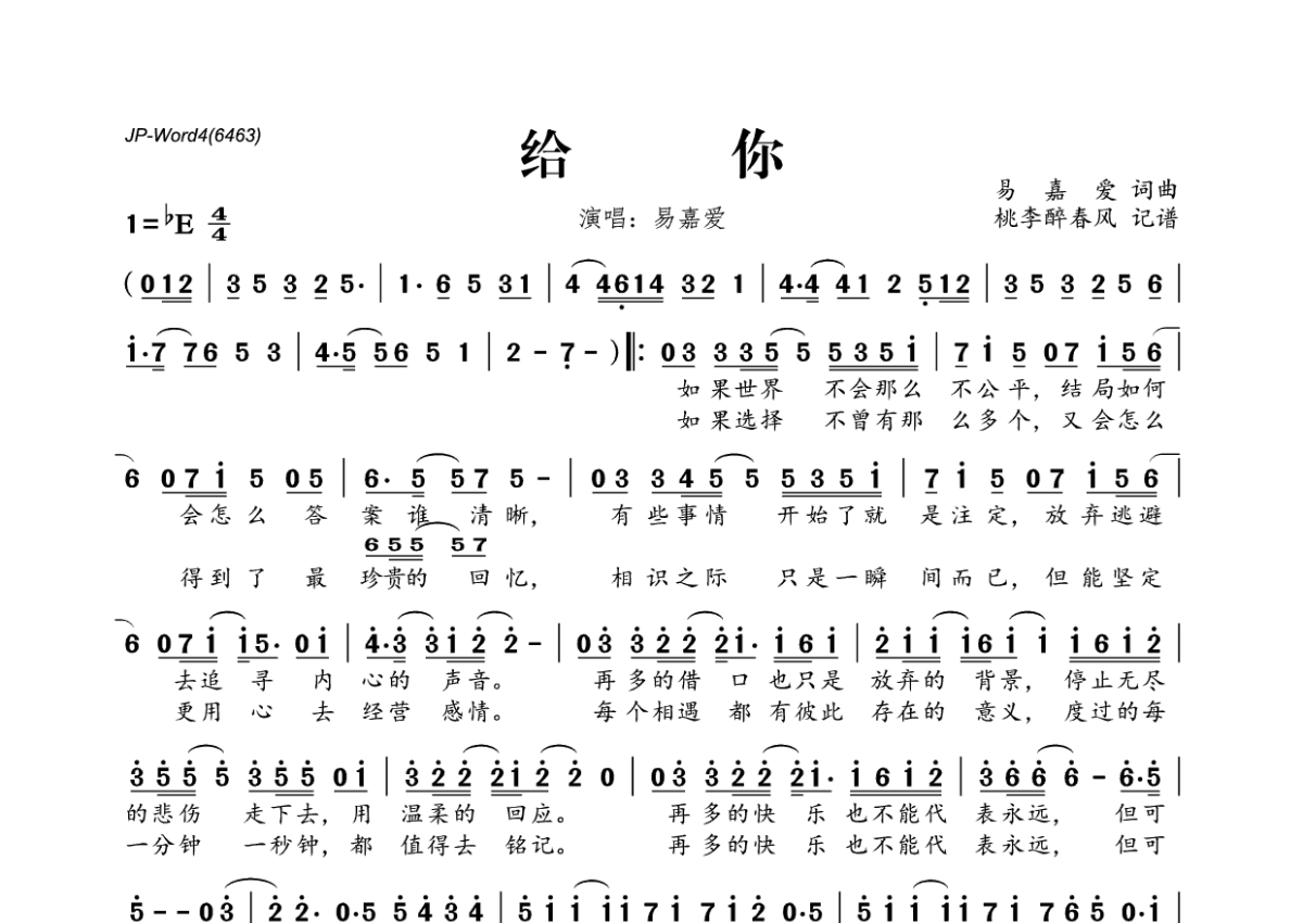 《给你》是易嘉爱演唱的一首歌曲,拍号为4/4拍,这份简谱共有一张高清图谱,图谱由 @桃李醉春风 编配上传。