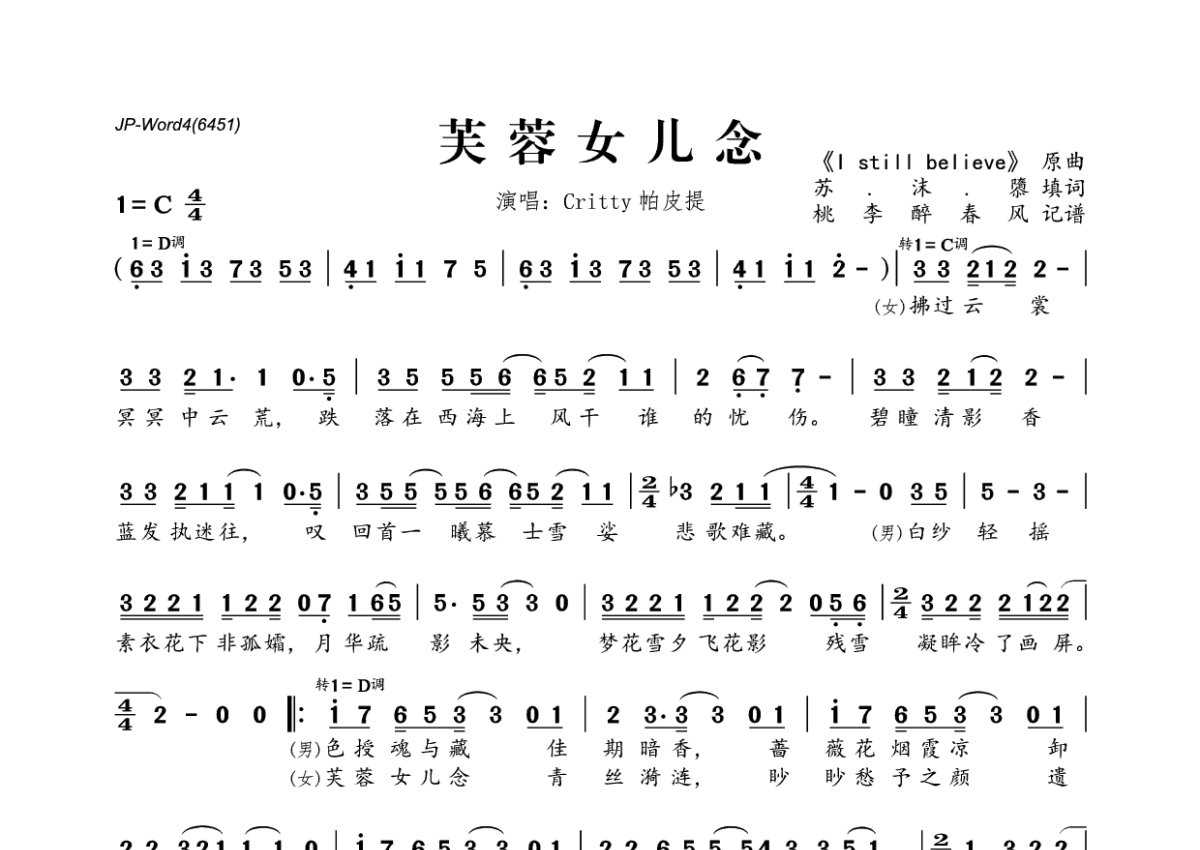 《芙蓉女儿念》是CRITTY演唱的一首歌曲,拍号为4/4拍,这份简谱共有两张高清图谱,图谱由 @桃李醉春风 编配上传。