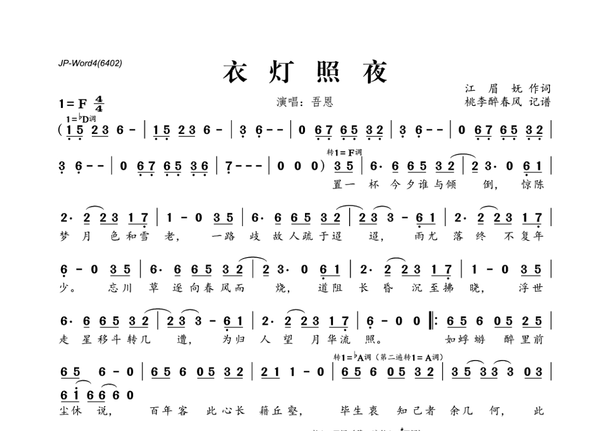 《衣灯照夜》是吾恩演唱的一首歌曲,拍号为4/4拍,这份简谱共有一张高清图谱,图谱由 @桃李醉春风 编配上传。