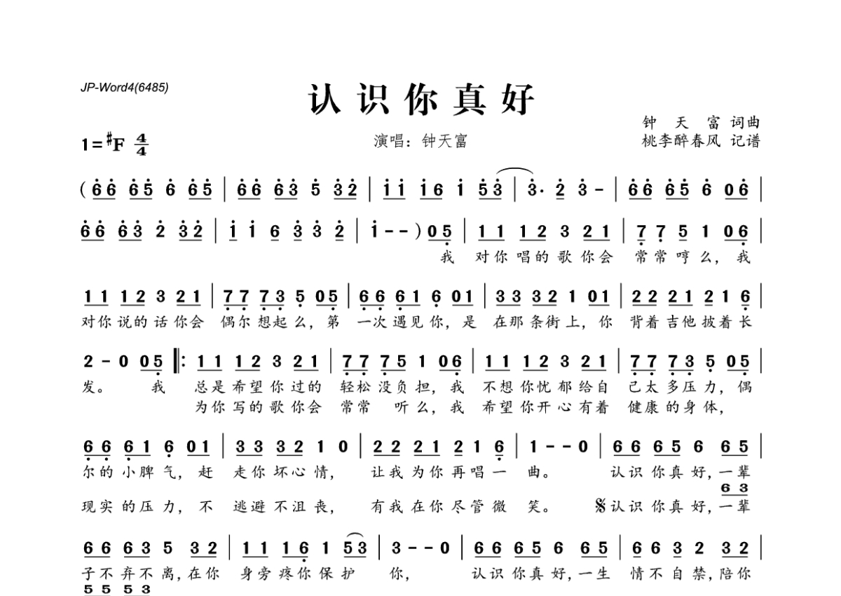 《认识你真好》是钟天富演唱的一首歌曲,拍号为4/4拍,这份简谱共有一张高清图谱,图谱由 @桃李醉春风 编配上传。
