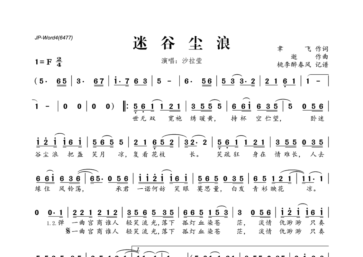 《迷谷尘浪》是沙拉莹演唱的一首歌曲,拍号为2/4拍,这份简谱共有一张高清图谱,图谱由 @桃李醉春风 编配上传。