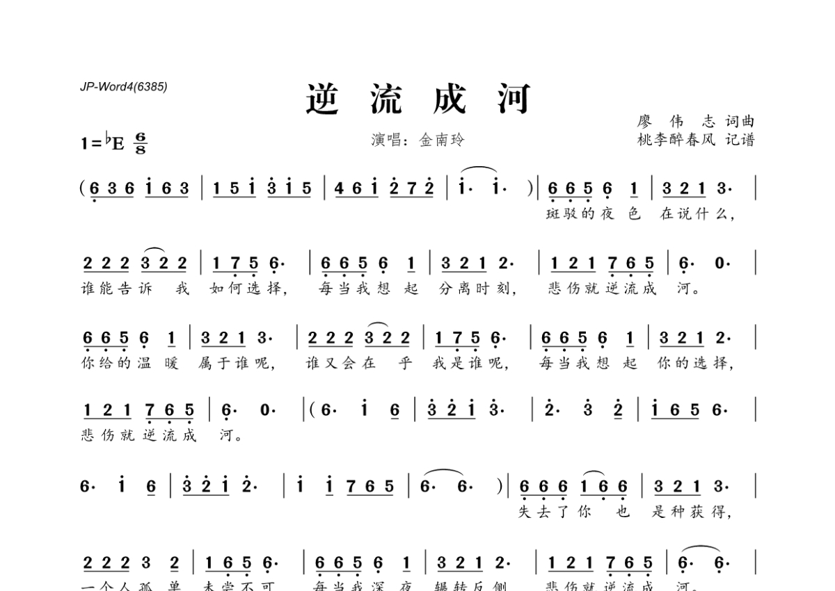 《逆流成河》是金南玲演唱的一首歌曲,拍号为6/8拍,这份简谱共有一张高清图谱,图谱由 @桃李醉春风 编配上传。
