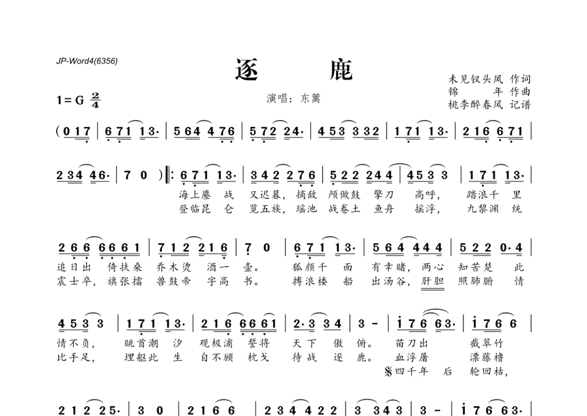 《逐鹿》是东篱演唱的一首歌曲,拍号为2/4拍,这份简谱共有一张高清图谱,图谱由 @桃李醉春风 编配上传。