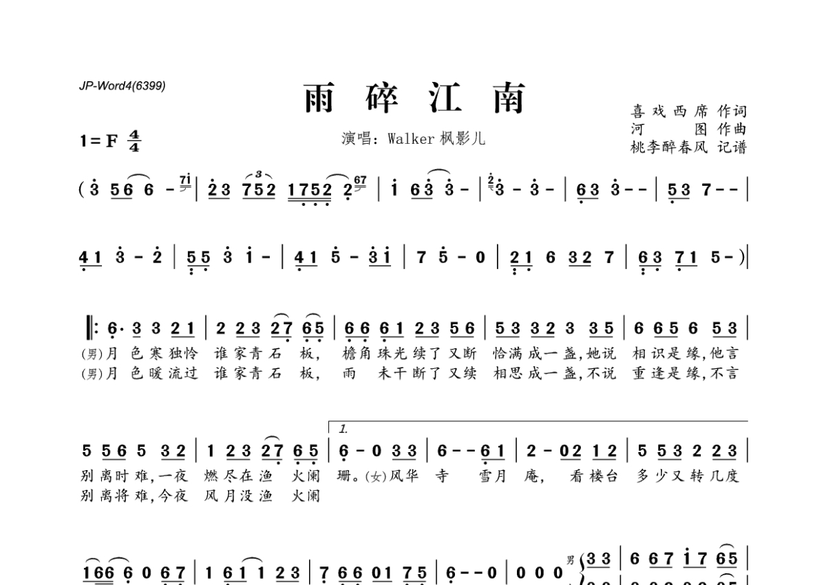《雨碎江南》是Walker&枫影儿演唱的一首歌曲,拍号为4/4拍,这份简谱共有两张高清图谱,图谱由 @桃李醉春风 编配上传。